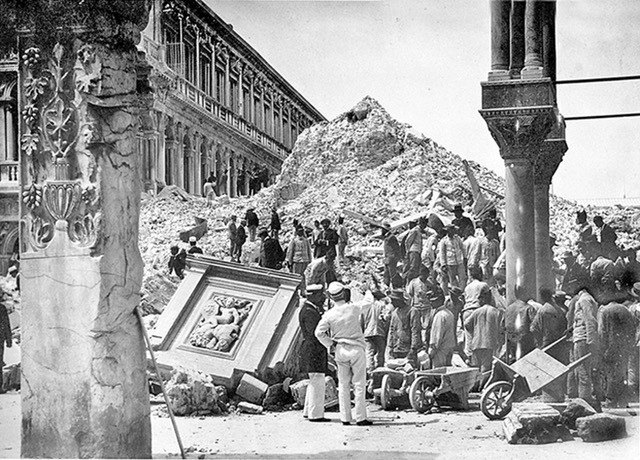 In July 1902 the famous bell-tower of St Mark’s Venice, the city’s totemic symbol, collapsed into a pile of rubble, crushing Sansovino’s sixteenth-century Loggetta beneath it and narrowly missing the slender columns of the Basilica. News of the disaster flashed by telegram round the world, and the shock and distress felt by Venetians at the sudden loss of their landmark campanile was intense.